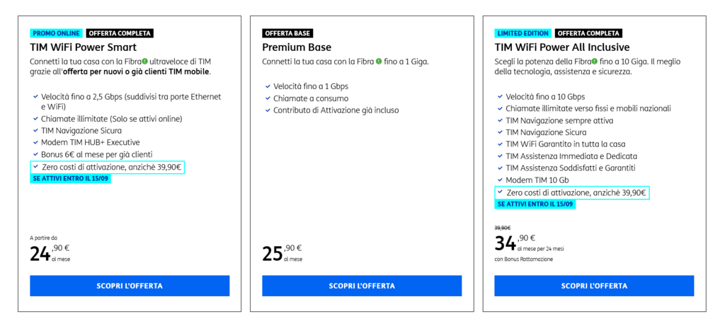 Tim Zero costi di attivazione fino al 22/09 per le seguenti offerte: - 24,90€ TIM WIFI POWER SMART per già clienti MOBILI - 29,90€ TIM WiFi Power Top - 34,90€ TIM WiFi Power All Inclusive